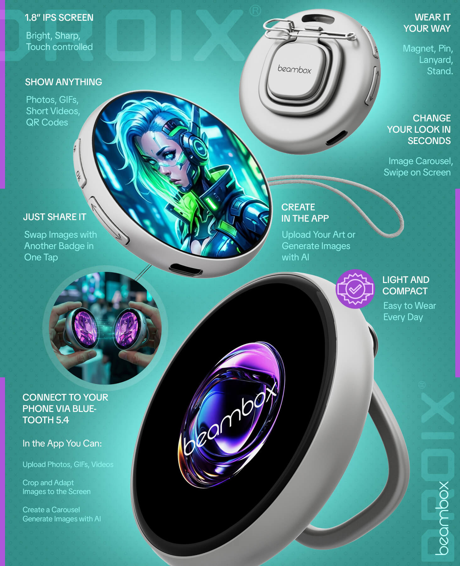 - Fast Connection: Connects instantly to the dedicated “Beambox” APP via Bluetooth V5.4 for ultra-fast content transmission and real-time updates.
